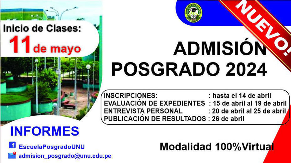 Para obtener más información y realizar consultas adicionales, se ha habilitado la página de Facebook de la Escuela de Posgrado de la UNU, así como la dirección de correo electrónico admisió[email protected], donde el equipo de admisiones estará atento para brindar la asesoría necesaria a los interesados.