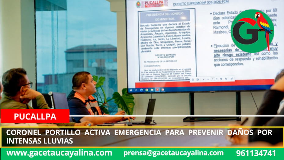 Pucallpa.- La Presidencia del Consejo de Ministros (PCM) declaró el estado de emergencia en la provincia de Coronel Portillo, región Ucayali, ante el peligro inminente por precipitaciones pluviales intensas, mediante el Decreto Supremo N.° 003-2026, vigente desde el 9 de enero hasta el 8 de marzo de 2026.