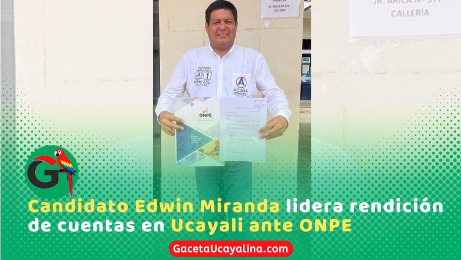 Pucallpa.- El candidato a Diputado por Ucayali, Edwin Miranda Ruiz, representante del partido Alianza para el Progreso, se convirtió este jueves en el primer aspirante de la región en presentar la sustentación de gastos de su campaña electoral ante la Oficina Nacional de Procesos Electorales.